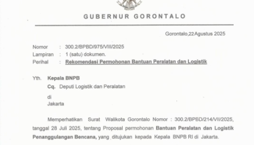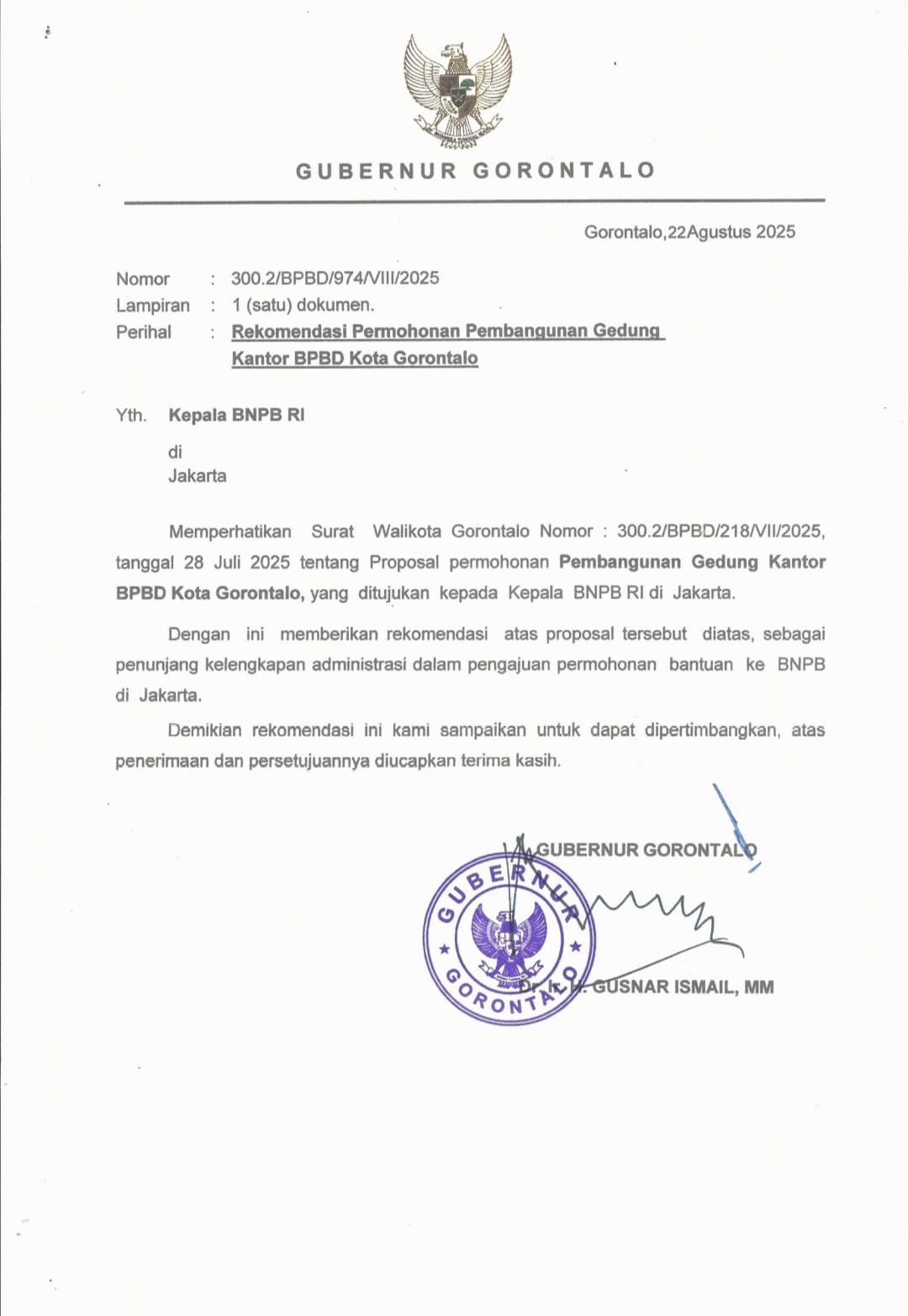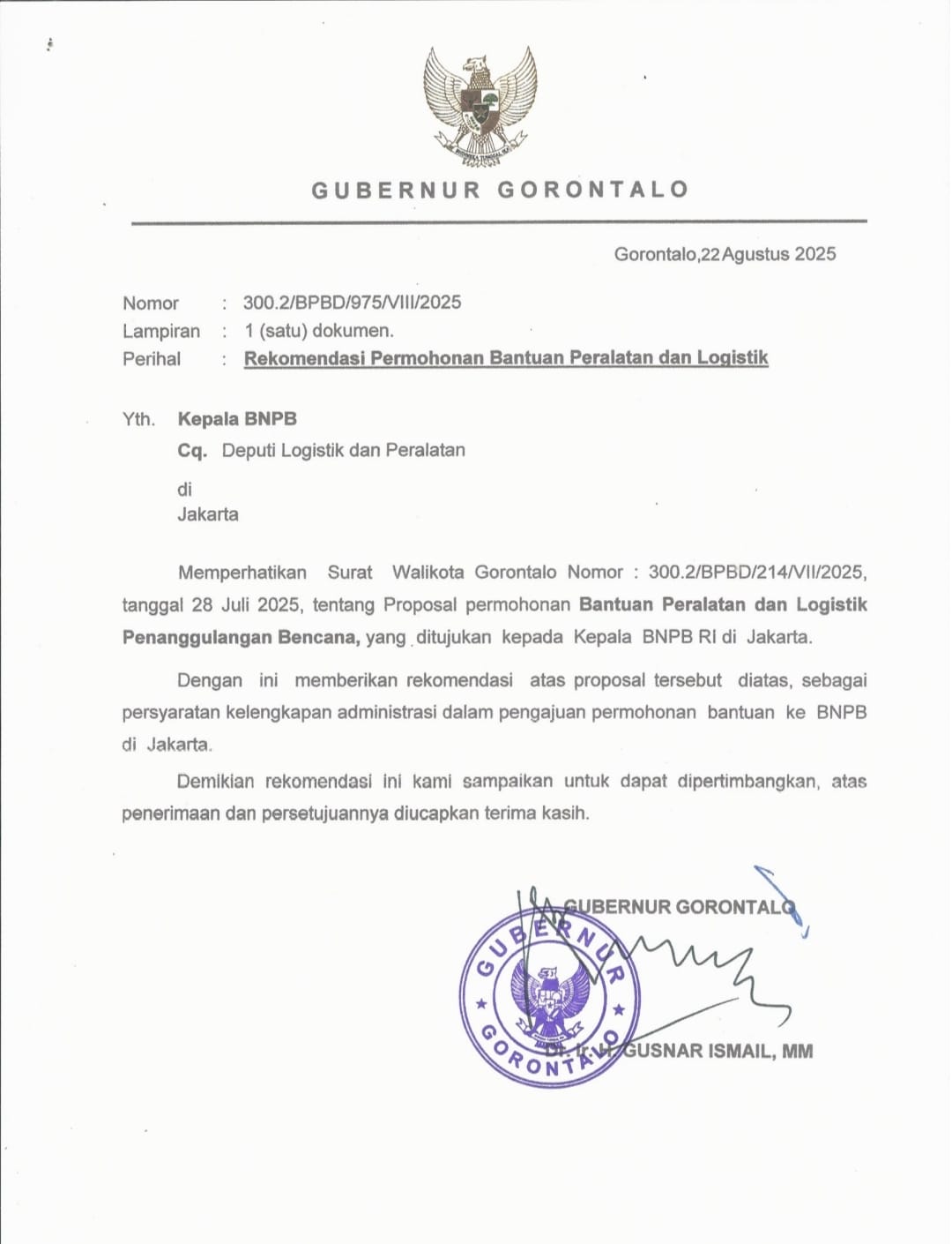 Dua rekeomndasi penting telah di tanda tangani gubernur Gusnar pada jumat 22 agustus 2025 tentang pembangunan gedung kantor BPBD Kota Gorontalo serta bantuan peralatan dan logistik penanggulangan bencana. Jelas Alvian.