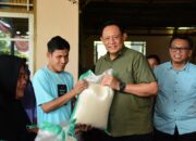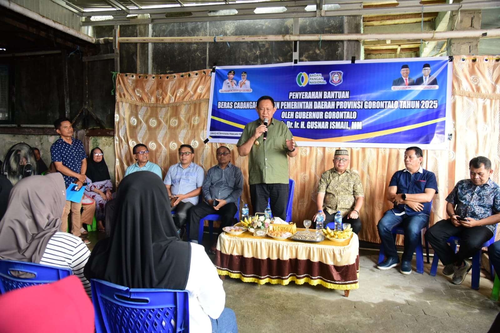 Gubernur Gorontalo Gusnar Ismail menyerahkan bantuan beras cadangan pangan pemerintah (CPP) daerah untuk keluarga penerima manfaat (KPM) di Kabupaten Gorontalo, Sabtu (6/9/2025). Bantuan untuk lima desa diserahkan secara simbolis di Desa Dumati, Kecamatan Telaga Biru.